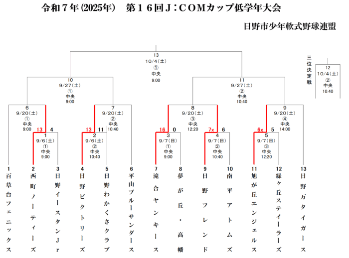 2025年9月7日 / 最終更新日時 : 2025年9月7日 renmei 試合結果 【9/7試合結果】第16回J:COMカップ低学年大会 一回戦 令和7年(2025年)第16回J:COMカップ低学年大会 一回戦●第一試合滝合ヤンキース ○16 – 0● 高幡イーグルス・夢が丘ユニコンズ(3回コールド)●第二試合日野フレンド ○7x – 6● 南平アトムズ●第三試合旭が丘エンジェルス ○6x – 5● 緑ヶ丘スティーラーズ \ 最新情報をチェック / FacebookXBlueskyHatenaCopy