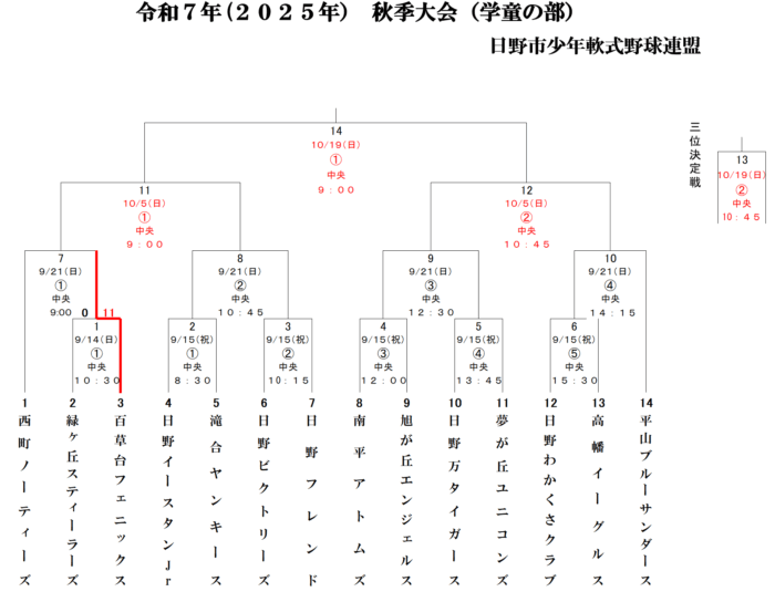 2025年9月14日 / 最終更新日時 : 2025年9月14日 renmei 試合結果 【9/14試合結果】令和7年(2025年)秋季大会 一回戦(学童・少年) 令和7年(2025年)秋季大会 一回戦(学童の部)●第一試合緑ヶ丘スティーラーズ ●0 – 11○ 百草台フェニックス 令和7年(2025年)秋季大会 一回戦(少年の部)●第二試合日野バックス ●6 – 8○ 百草台フェニックス \ 最新情報をチェック / FacebookXBlueskyHatenaCopy